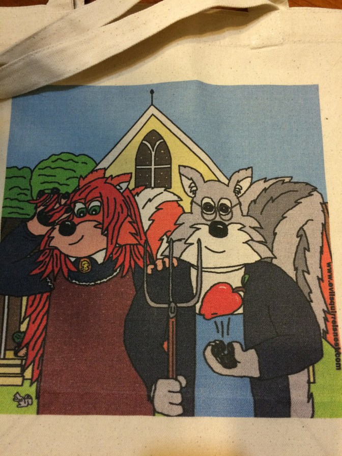 As a prize I was able to pick out something from The Evil Squirrel’s Cafe Press shop. Oh I can’t tell you how delighted I was to receive my American Gothic Bag a few weeks later. I LOVE THIS. I’ll be taking it on my cross country trip from Orangevale, CA to Lincoln, NE this summer. I’ll be taking it to a coffee shop this morning. I’ll be taking it everywhere.