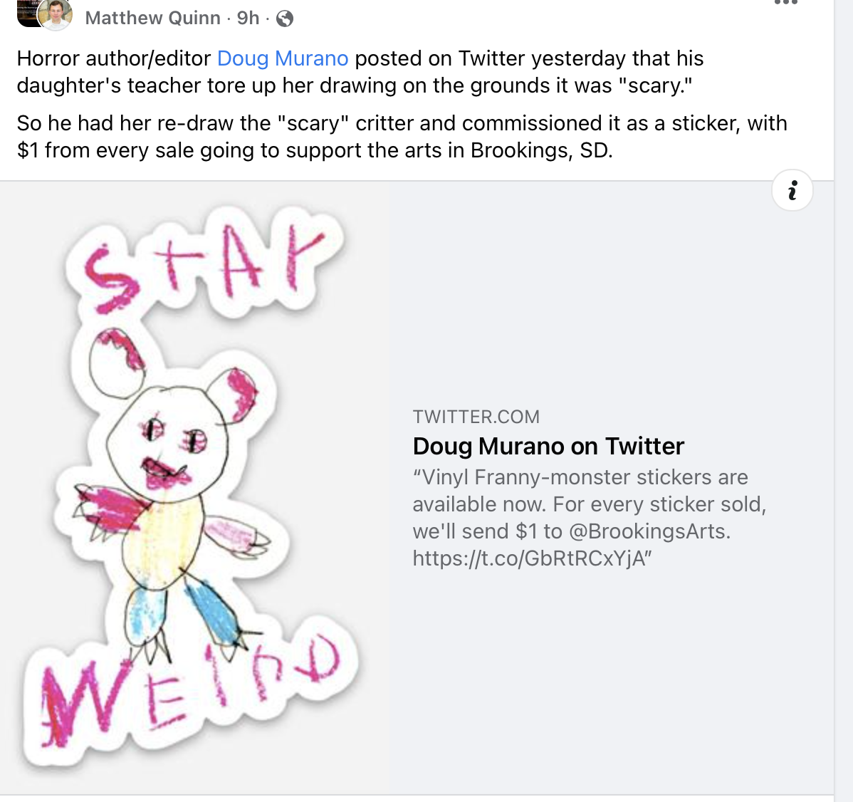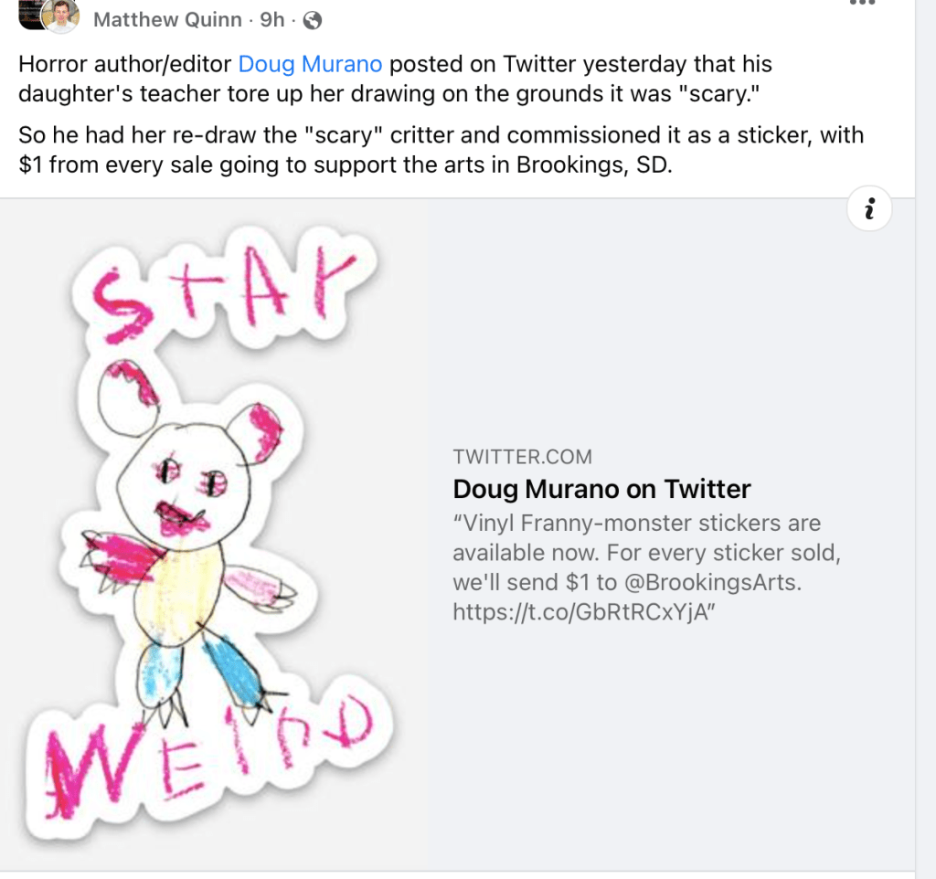 In the meantime, Murano had his daughter re-do the drawing in question and commissioned it as a $5 sticker. $1 from every sale will benefit the Brookings Arts Council in Brookings, South Dakota.