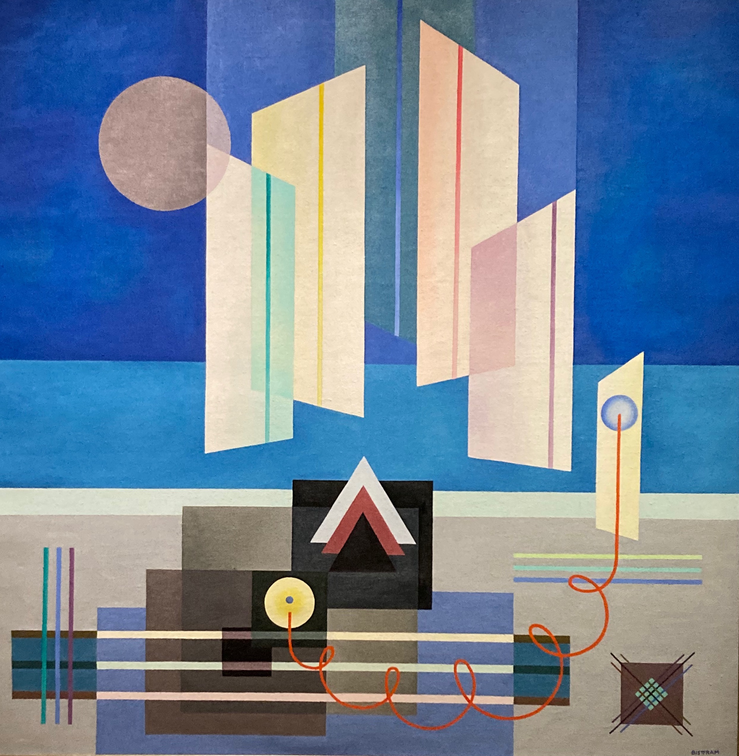 The elevator led us up to the main exhibit “Another World – The Transcendental Painting Group”. This group of artist, who worked out of New Mexico in the 1930’s was not of the Transcendental Meditation ilk. They studied the philosophy of bringing the light from the inside to their paintings and drawings, not through figurative or landscape images, but through extremely graphic compositions with overlapping color and light. This philosophy also overlapped with film, music, and sculpture. The art is based in human need. That is the need for communicating beyond the world in which we live in everyday and painting nonobjective works with otherworldly beauty. It is such a unique group, that it is difficult to describe both the artwork and the philosophy.