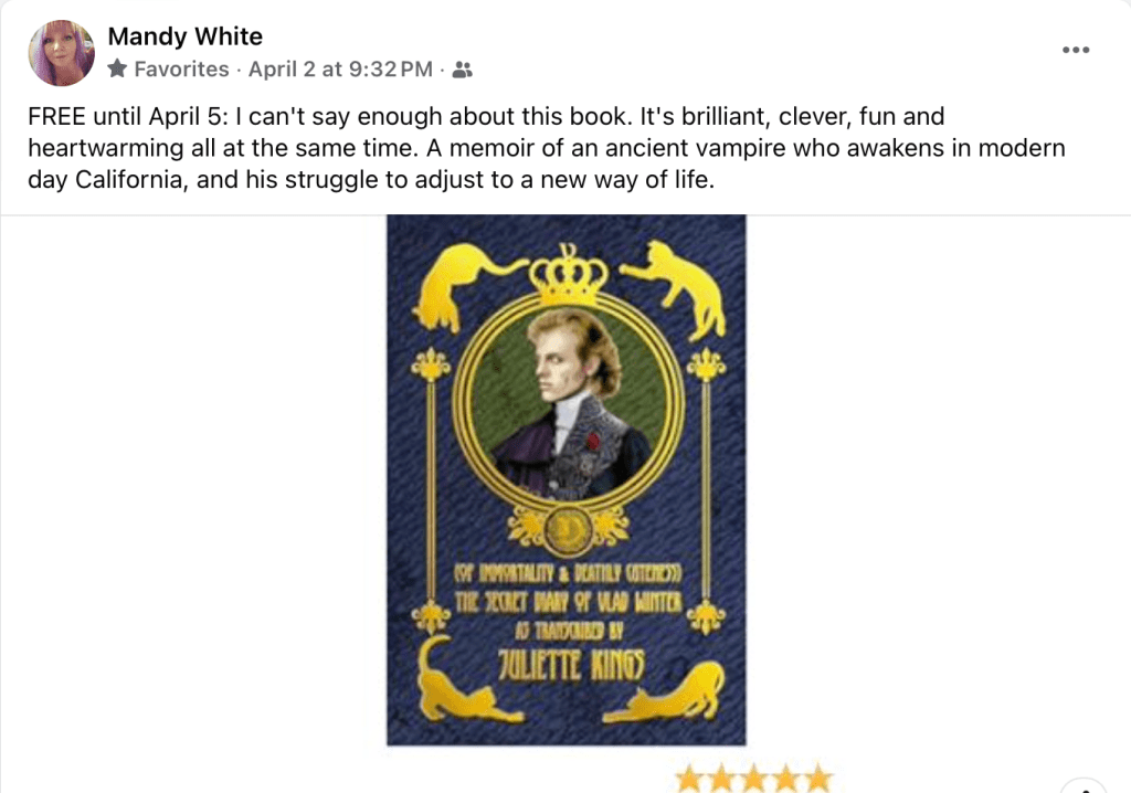 Books, Cats, Fun Books, Modern Vampires, New Books, Online Books “I can’t say enough about this book. It’s Brilliant, clever, fun and heartwarming all at the same time.” Free download through April 5, 2024. Share this with your friends:Tweet Print (Opens in new window) Print Share on Bluesky (Opens in new window) Bluesky Email a link to a friend (Opens in new window) Email Share on Tumblr Share on Threads (Opens in new window) Threads Share on Reddit (Opens in new window) Reddit Like Loading... Published by Juliette Kings I'm a mom, artist and writer, living in California. Westcoastreview.wordpress.com and Vampiremaman.com View all posts by Juliette Kings